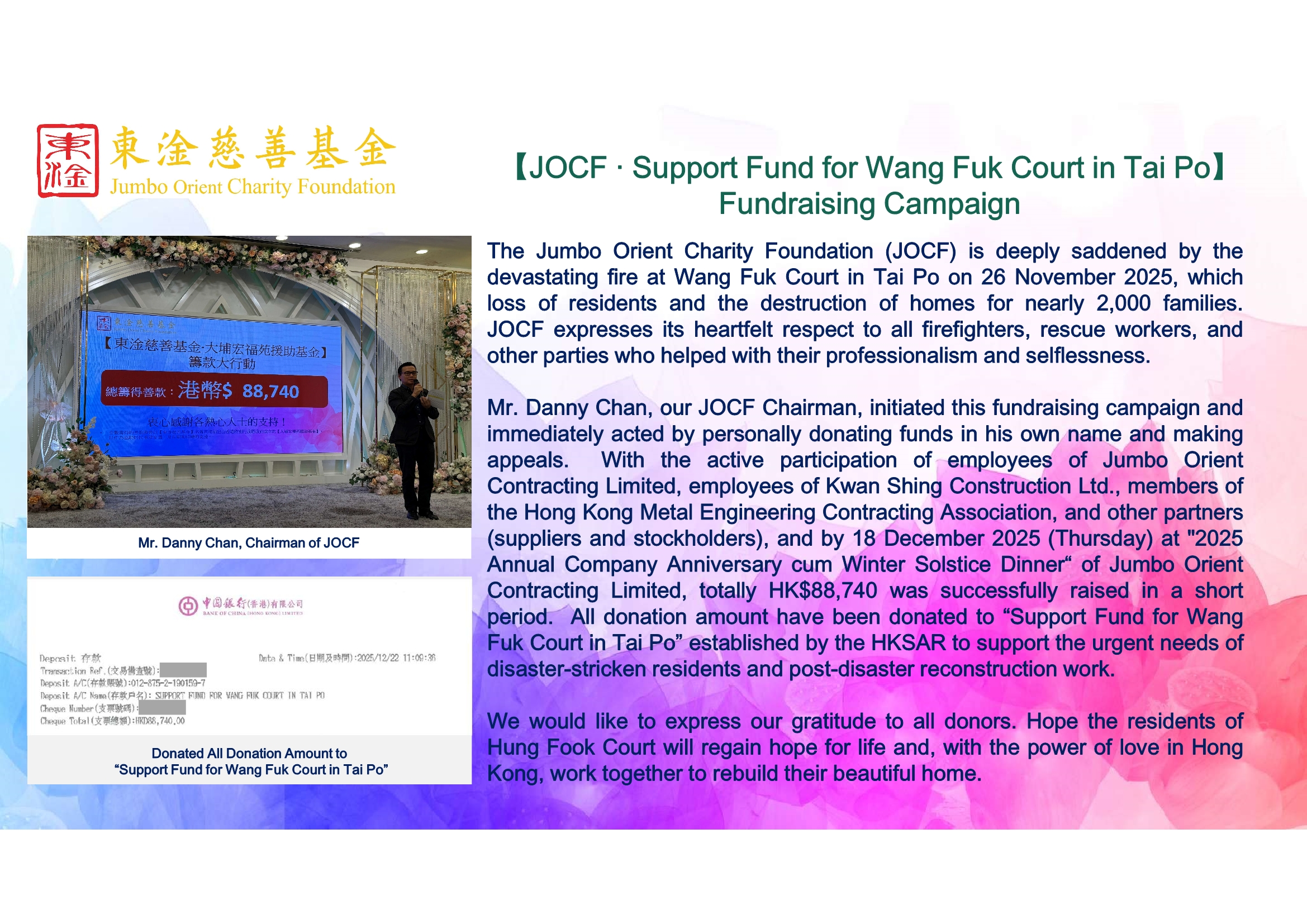 JOCF ‧ Support Fund for Wang Fuk Court in Tai Po】 Fundraising Campaign