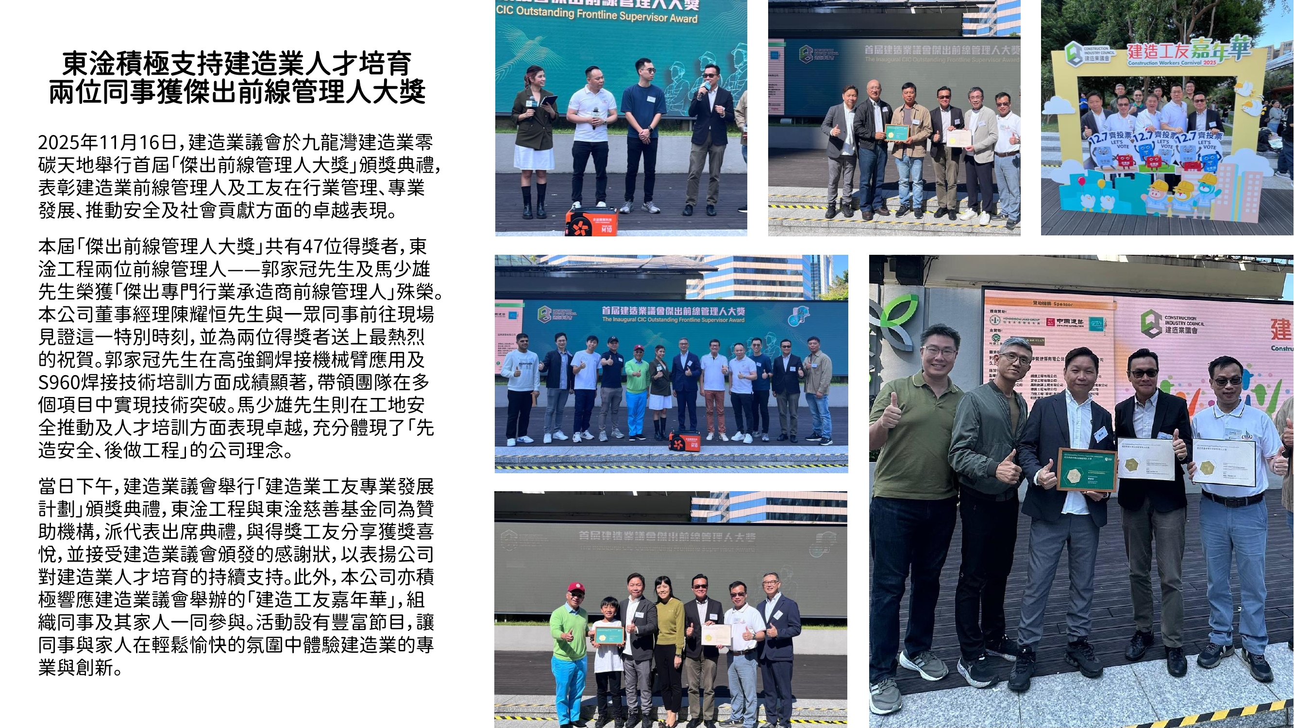 東淦積極支持建造業人才培育︰兩位同事獲傑出前線管理人大獎